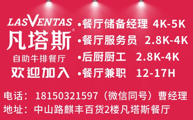 誠聘:洗碗工:數(shù)名,50歲以下,能適應(yīng)上早晚班;傳菜員/服務(wù)員:數(shù)名,45歲以下,能吃苦;包食宿月休6天,繳納醫(yī)社保,待遇面談, 電話:18150325616林經(jīng)理
