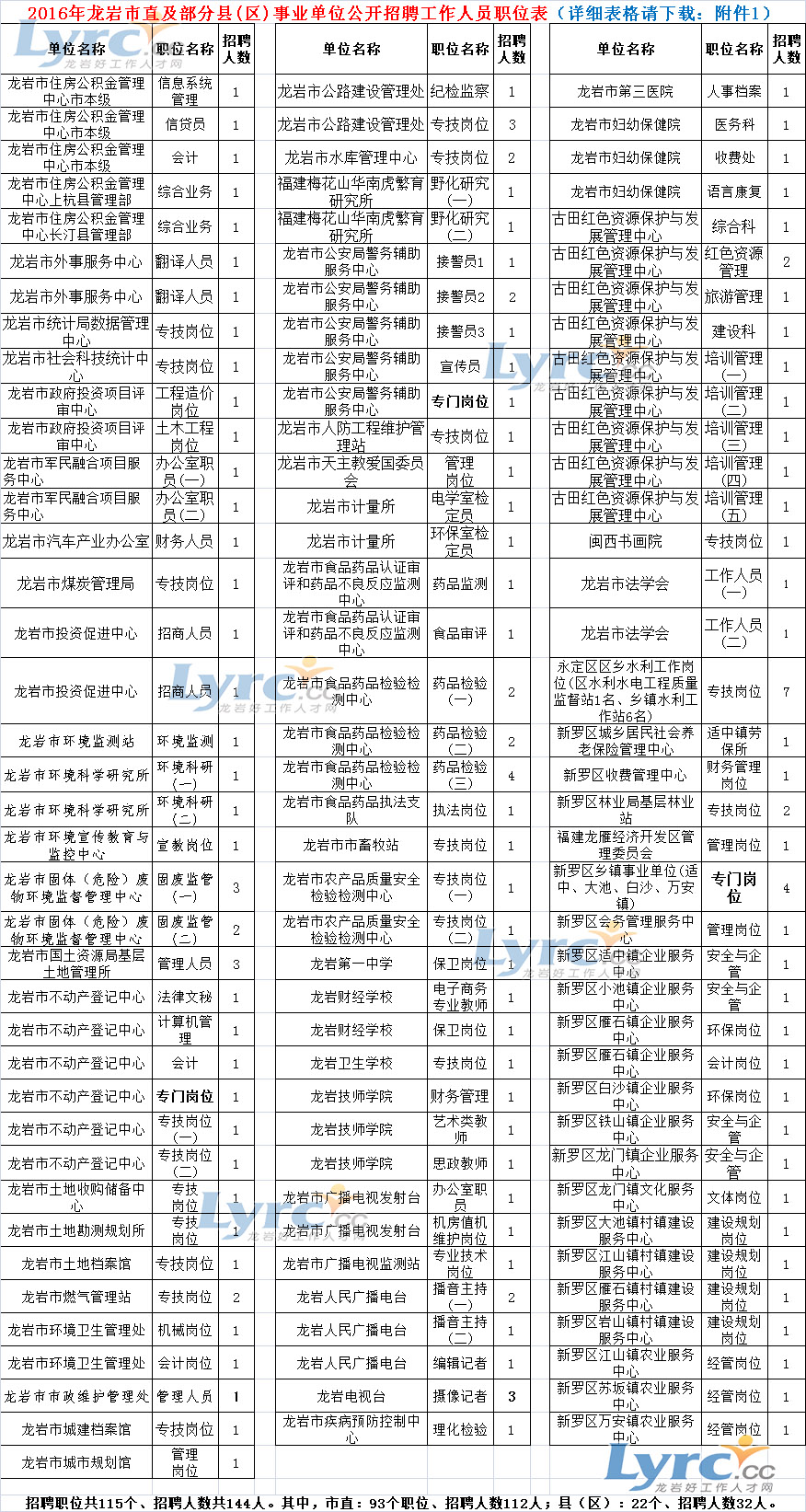 本次公開招聘職位為龍巖市直及部分縣(區(qū))事業(yè)單位編制內(nèi)工作人員,招聘職位115個(gè),計(jì)劃招聘人數(shù)144人,其中市直事業(yè)單位招聘職位93個(gè),計(jì)劃招聘人數(shù)112人;部分縣(區(qū))事業(yè)單位委托招聘職位22個(gè),計(jì)劃招聘人數(shù)32人。具體招聘職位詳見《2016年龍巖市直及部分縣(區(qū))事業(yè)單位公開招聘工作人員職位表》(以下簡稱《職位表》,附件1)。