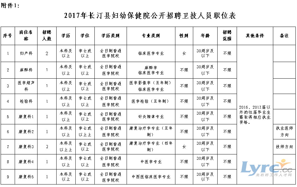 詳見《2017年長(zhǎng)汀縣婦幼保健院公開招聘衛(wèi)技人員職位表》(附件1)。