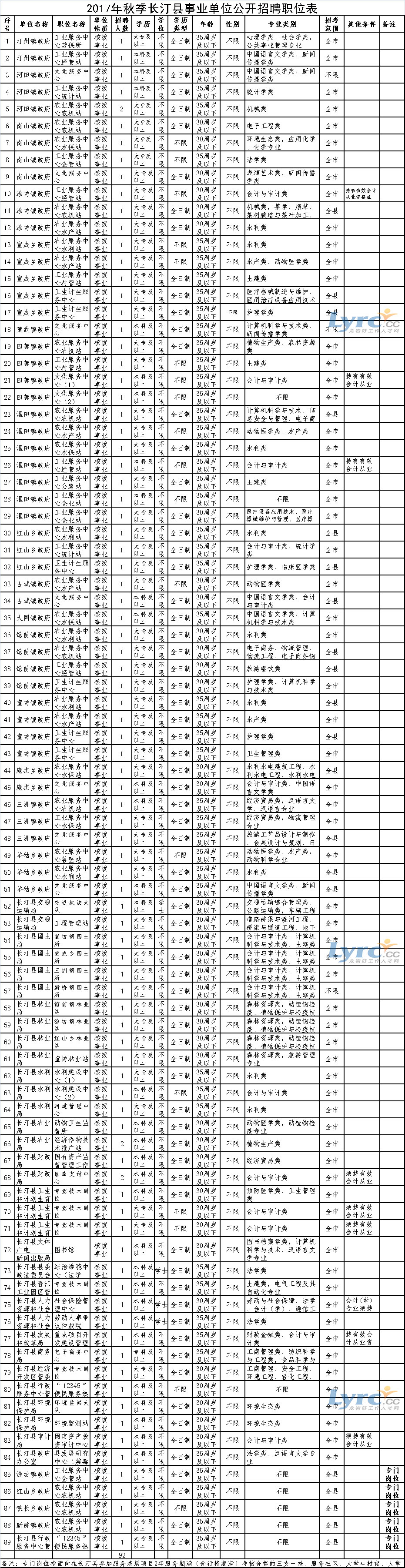 2017年秋季我縣面向社會公開招聘92人,具體招聘人數(shù)、崗位、資格條件等詳見《2017年秋季長汀縣事業(yè)單位公開招聘工作人員職位表》(見附件)。