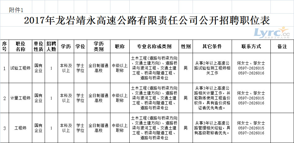 詳見附件1《2017年龍巖靖永高速公路有限責(zé)任公司公開招聘職位表》。