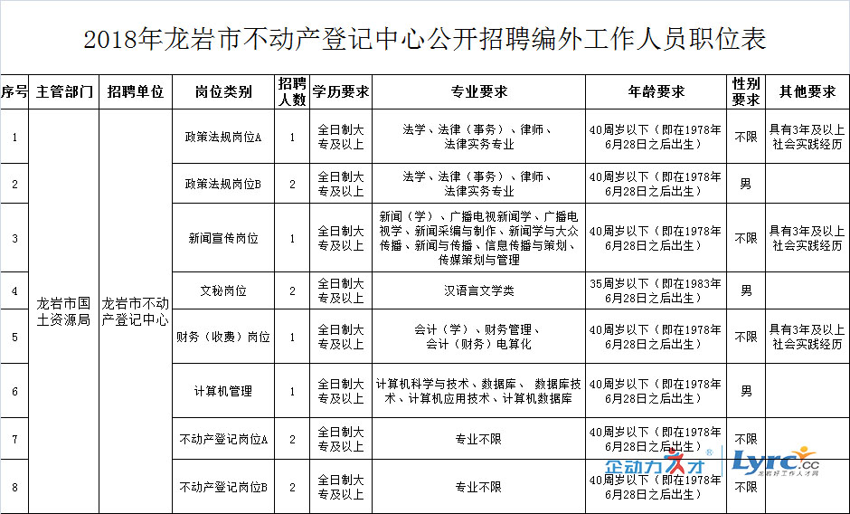 本次公開(kāi)招聘12名編外工作人員,具體要求詳見(jiàn)《2018年龍巖市不動(dòng)產(chǎn)登記中心公開(kāi)招聘編外工作人員職位表》(附件1)。