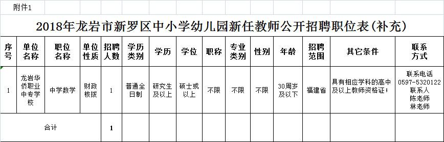 招聘的具體崗位、人數(shù)及任職條件等見附件《新羅區(qū)教育系統(tǒng)中小學(xué)、幼兒園公開招聘工作人員職位表》(補(bǔ)充)。