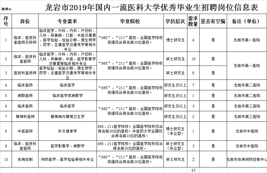 • 龍巖市選拔引進(jìn)2019年國(guó)內(nèi)一流醫(yī)科大學(xué)優(yōu)秀畢業(yè)生的公告