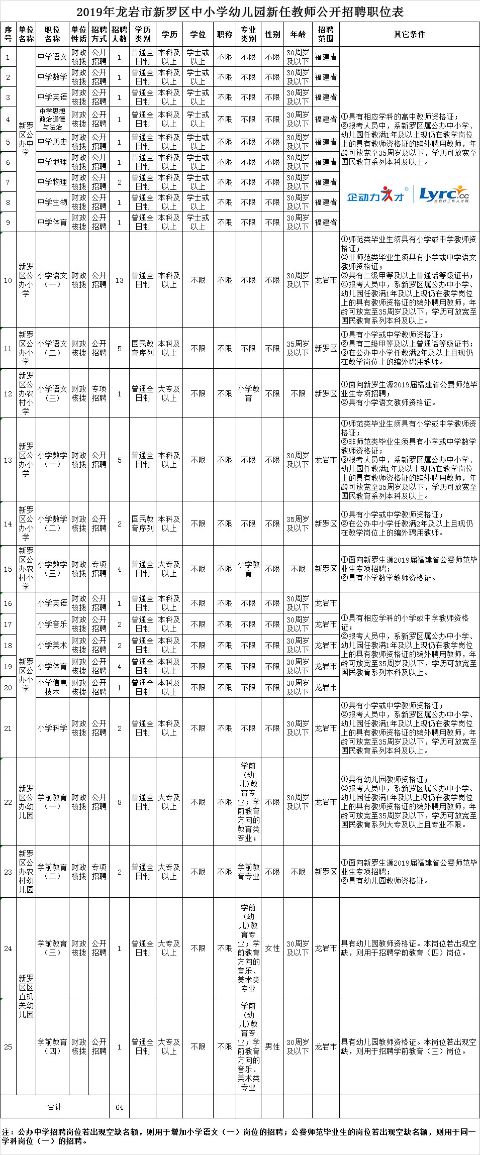 全區(qū)共招聘64名,其中:中學(xué)教師10名,小學(xué)教師42名(其中:新羅生源2019年福建省免費(fèi)師范男生5名),幼兒園教師12名(其中:新羅生源2019年福建省免費(fèi)師范男生2名、新羅區(qū)直機(jī)關(guān)幼兒園2名)。招聘的具體崗位、人數(shù)及任職條件等詳見《2019年龍巖市新羅區(qū)中小學(xué)幼兒園新任教師公開招聘職位表》(附件1)。