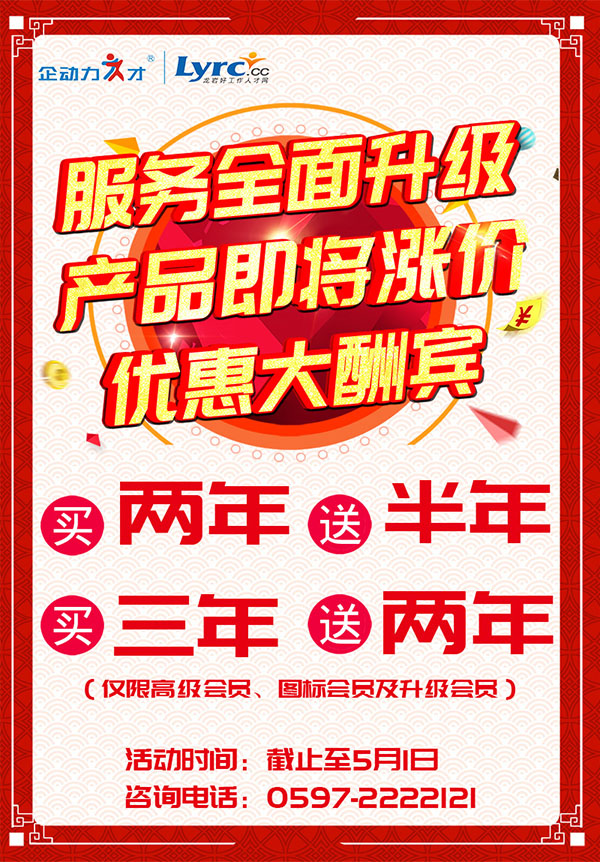 關(guān)于此次龍巖好工作人才網(wǎng)收費標準調(diào)整細節(jié),企業(yè)可致電龍巖好工作人才網(wǎng)客服:0597-2222121 。