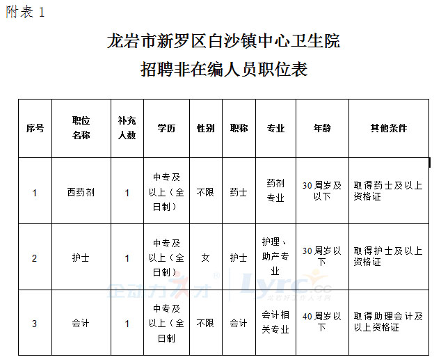 本次公開(kāi)招聘非在編人員3名,具體的招聘職位、招聘人數(shù)及職位資格條件等,詳見(jiàn)《龍巖市新羅區(qū)白沙鎮(zhèn)中心衛(wèi)生院公開(kāi)招聘非在編人員職位表》(見(jiàn)附件1)。