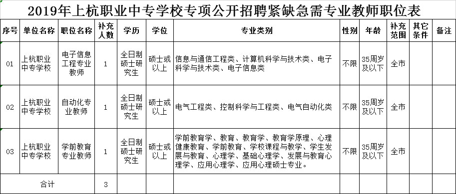 招聘3人,為事業(yè)單位編制內(nèi)招聘,其中:自動化專業(yè)教師1名、電子信息工程專業(yè)教師1名、學(xué)前教育專業(yè)教師1名。具體的招聘職位及任職條件要求等見附件《2019年上杭職業(yè)中專學(xué)校專項(xiàng)公開招聘緊缺急需專業(yè)教師職位表》。