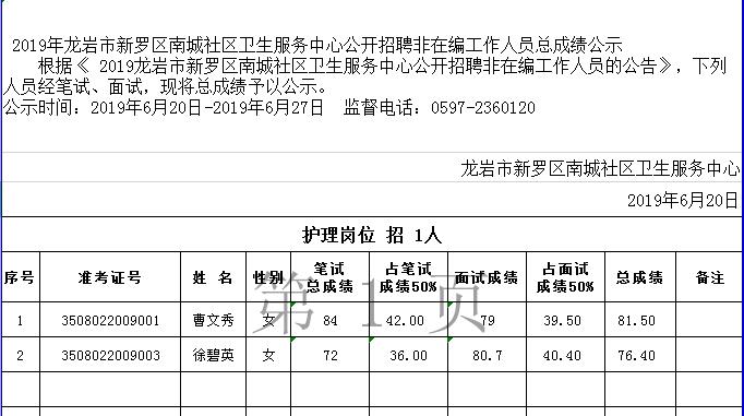 您當前的位置:首頁 > 新羅區(qū)國有企事業(yè) > 【名單公示】 2019年龍巖市新羅區(qū)南城社區(qū)衛(wèi)生服務(wù)中心公開招聘非在編工作人員總成績公示