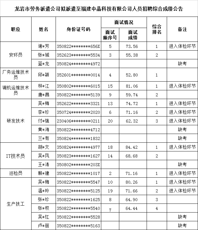 您當前的位置:首頁 > 新羅區(qū)國有企事業(yè) > 【名單公示】龍巖市勞務派遣公司擬派遣至福建中晶科技有限公司人員招聘綜合成績公示
