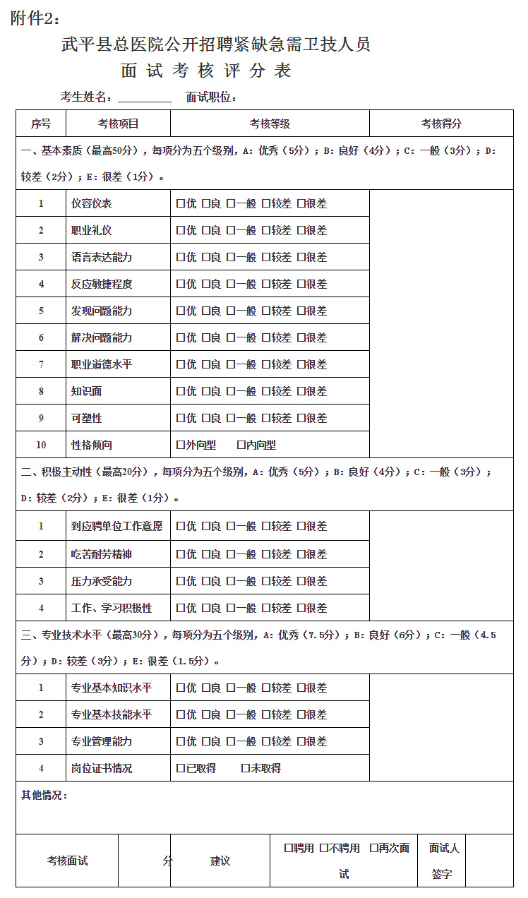 2.武平縣總醫(yī)院公開(kāi)招聘緊缺急需衛(wèi)技人員面試考核評(píng)分表