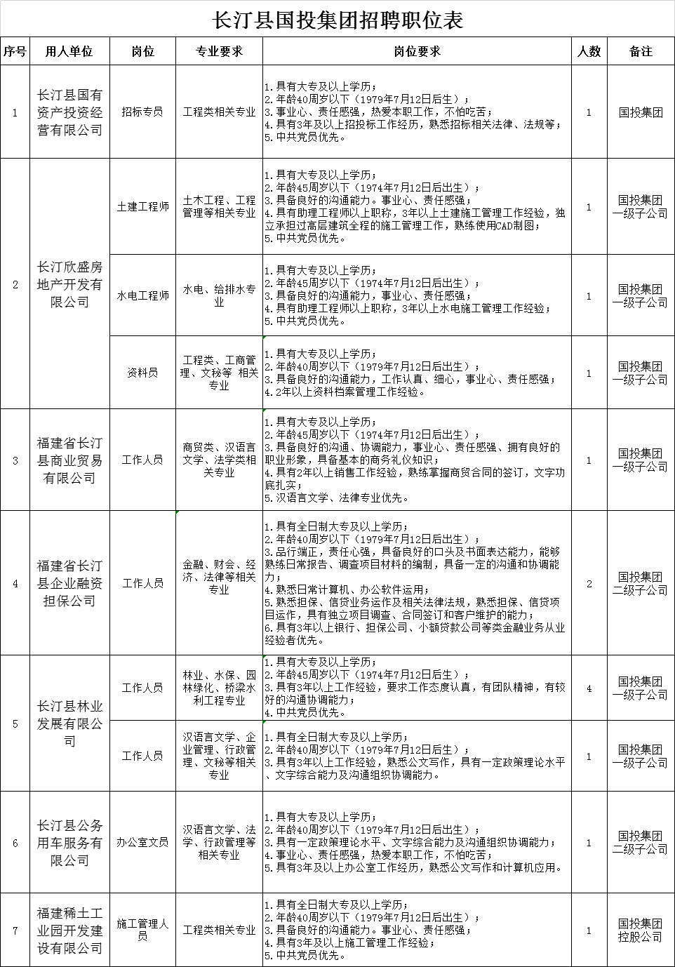 • 長(zhǎng)汀縣國(guó)有資產(chǎn)投資經(jīng)營(yíng)有限公司2019年人才招聘方案