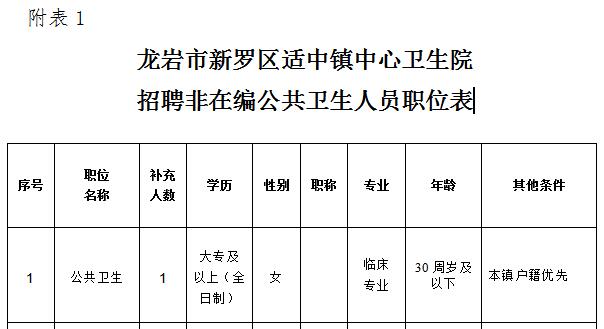 本次公開招聘非在編公共衛(wèi)生人員1名,具體的招聘職位、招聘人數(shù)及職位資格條件等,詳見《龍巖市新羅區(qū)適中鎮(zhèn)中心衛(wèi)生院公開招聘非在編公共衛(wèi)生人員職位表》(見附件1)。