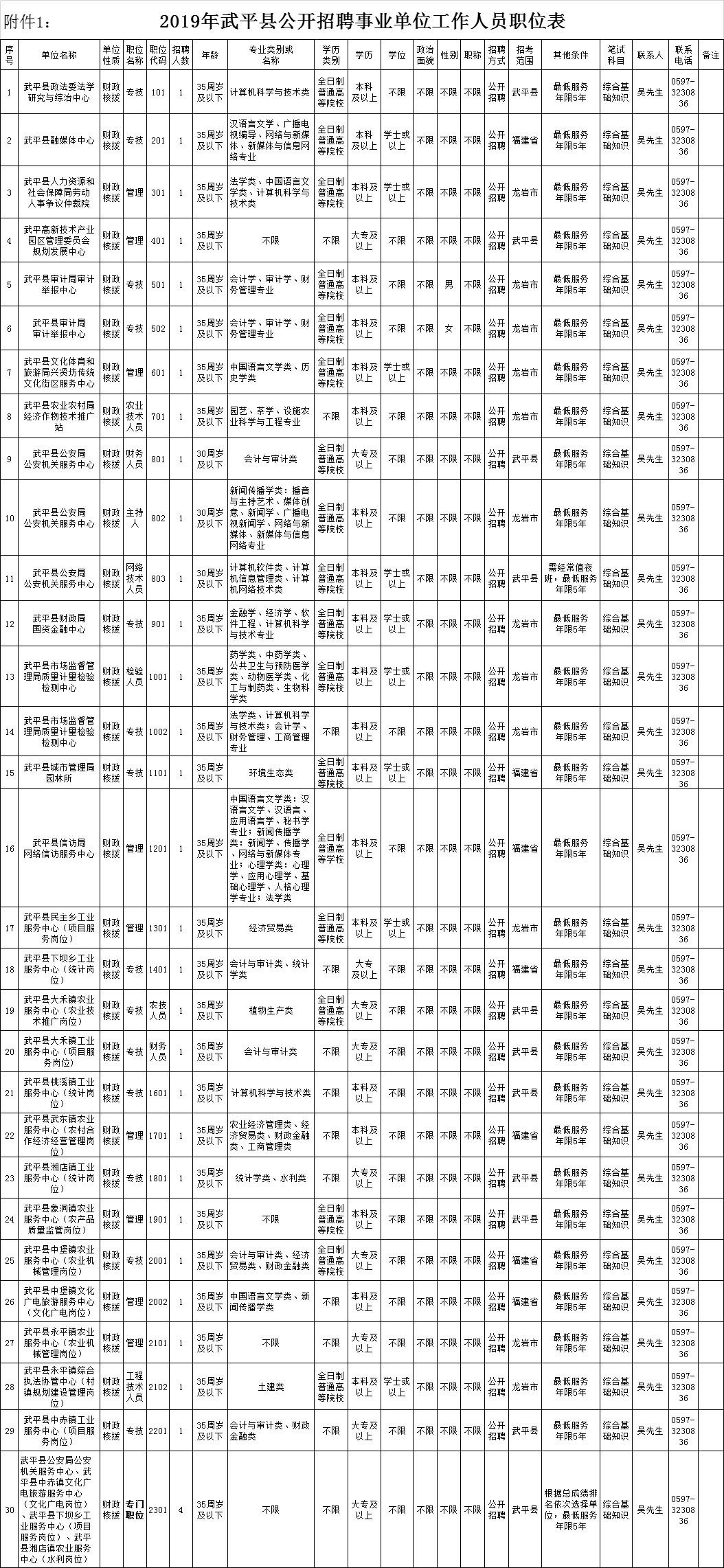 本次公開招聘職位為武平縣屬事業(yè)單位編制內(nèi)工作人員,計劃招聘人數(shù)33人,具體的招聘職位、人數(shù)、職位資格條件等詳見《2019年武平縣公開招聘事業(yè)單位工作人員職位表》(附件1)。