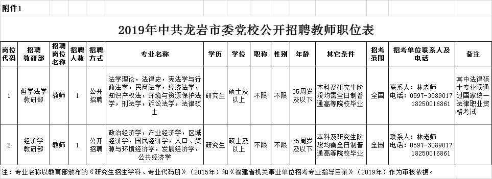 詳見《2019年中共龍巖市委黨校公開招聘教師職位表》(附件1)。