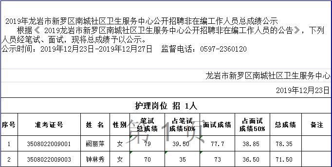 您當前的位置:首頁 > 新羅區(qū)國有企事業(yè) > 【成績公示】2019年龍巖市新羅區(qū)南城衛(wèi)生服務(wù)中心公開招聘非在編工作人員總成績公示