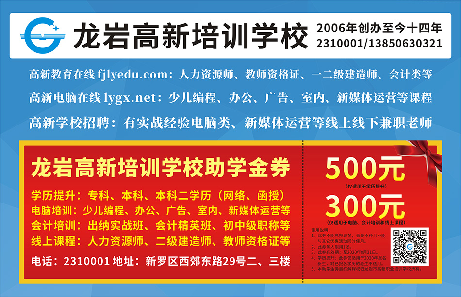 • 發(fā)布時間:2020/2/19 11:50:29  |  來源:龍巖培訓(xùn)網(wǎng)  |  已瀏覽 人次