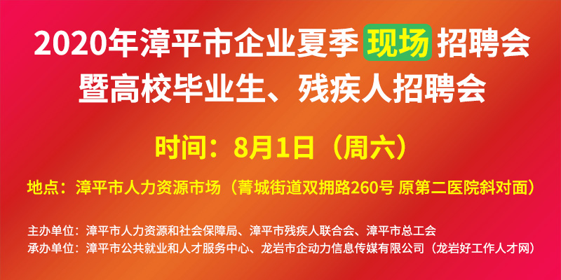• 【8月1日招聘會】2020年漳平市企業(yè)夏季現(xiàn)場招聘會暨高校畢業(yè)生招聘會、殘疾人招聘會