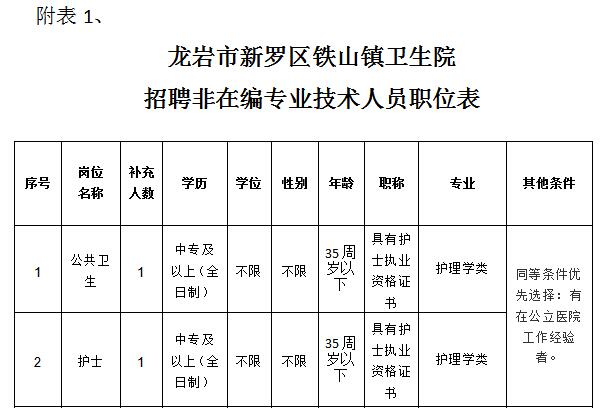 附表1:龍巖市新羅區(qū)鐵山鎮(zhèn)衛(wèi)生院招聘非在編專業(yè)技術(shù)人員職位表