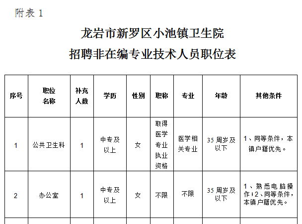附表1龍巖市新羅區(qū)小池鎮(zhèn)衛(wèi)生院招聘非在編專業(yè)技術(shù)人員職位表