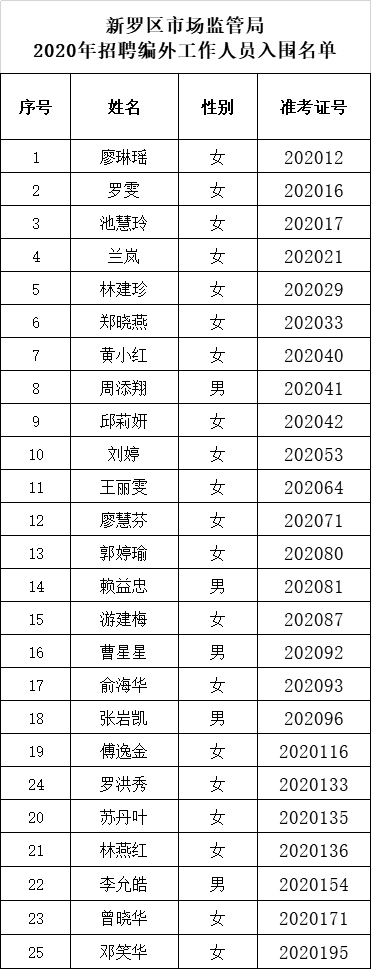 您當(dāng)前的位置:首頁(yè) > 新羅區(qū)國(guó)有企事業(yè) > 【入圍名單】新羅區(qū)市場(chǎng)監(jiān)管局關(guān)于2020年招聘 編外工作人員入圍名單及有關(guān)事項(xiàng)的公告