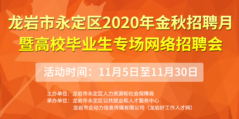 • 龍巖市永定區(qū)2020年金秋招聘月暨高校畢業(yè)生專場(chǎng)網(wǎng)絡(luò)招聘會(huì)