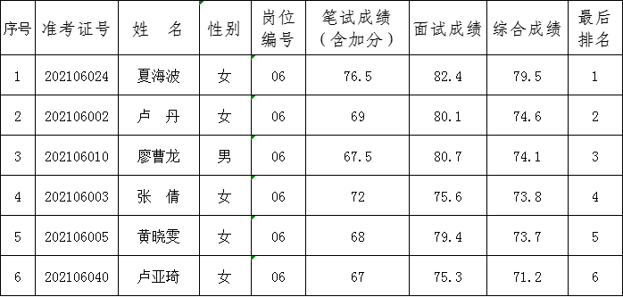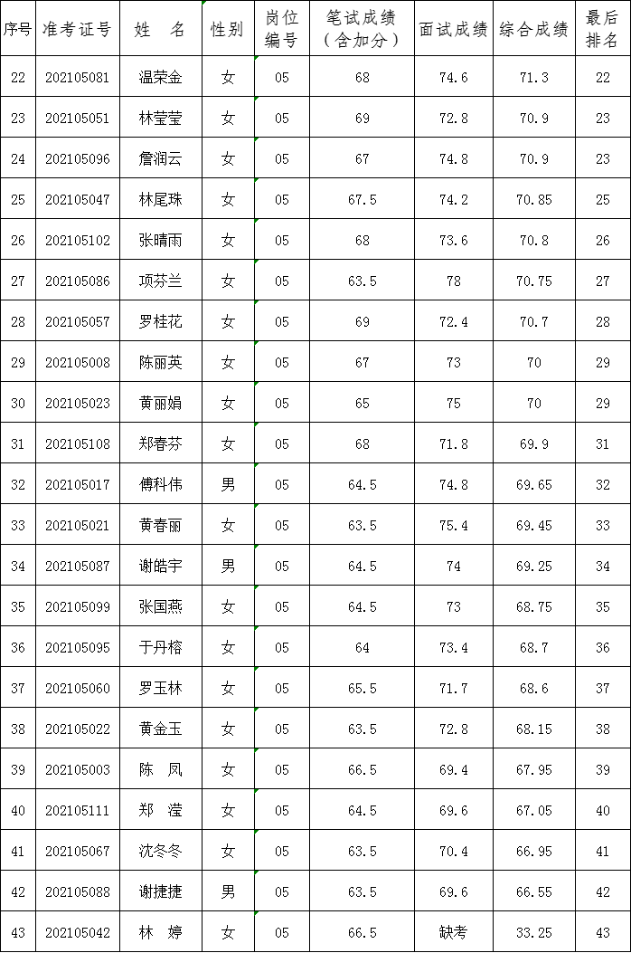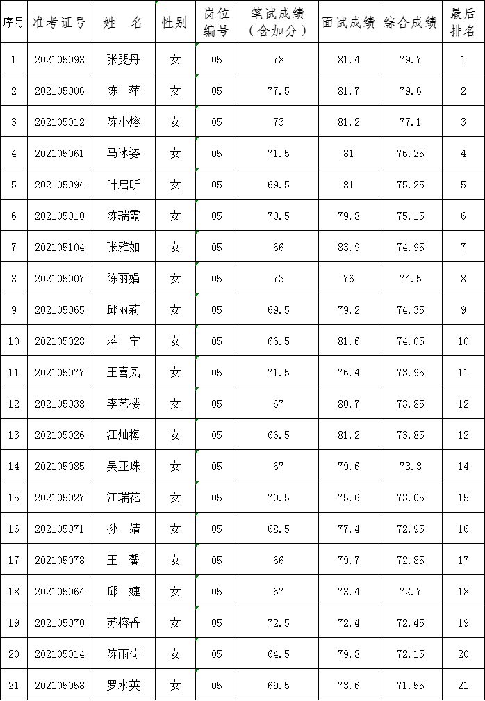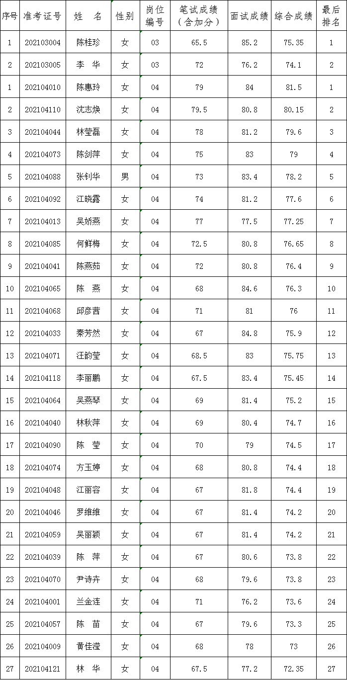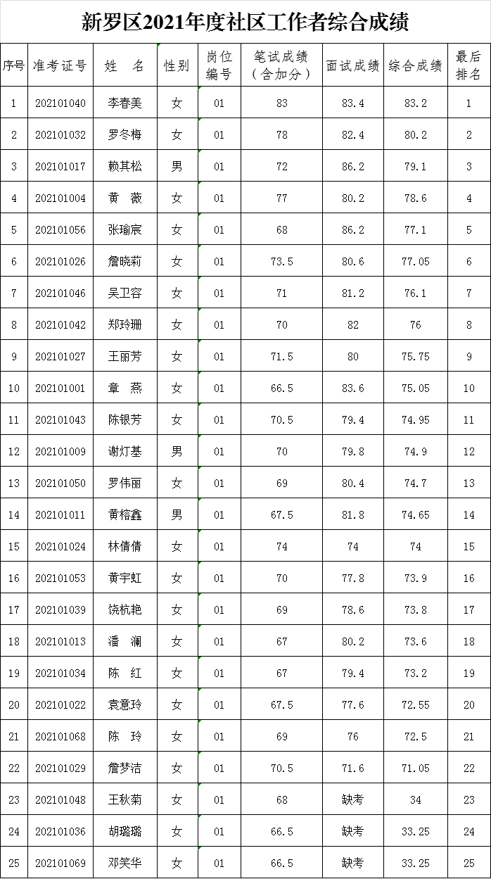 •  根據(jù)《中共新羅區(qū)委組織部 新羅區(qū)民政局關(guān)于公開招聘社區(qū)工作者的公告》有關(guān)要求,經(jīng)筆試、面試,現(xiàn)將綜合成績(jī)予以公示: