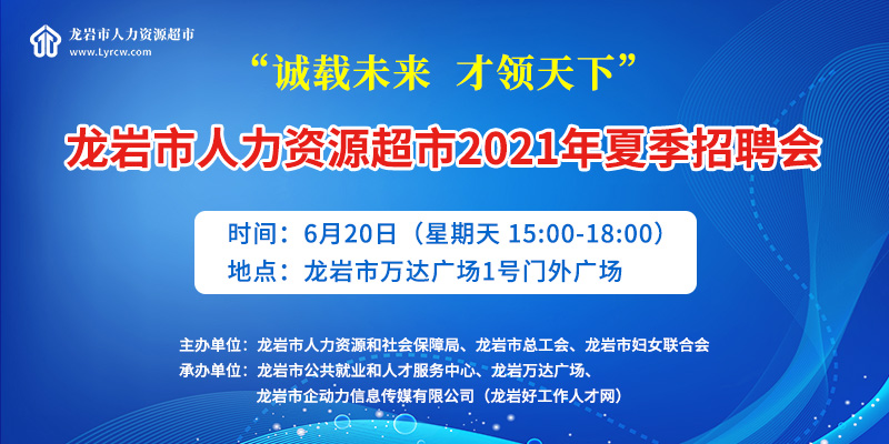 一、活動(dòng)主題:“誠載未來 才領(lǐng)天下” 龍巖市人力資源超市2021年夏季招聘會(huì)