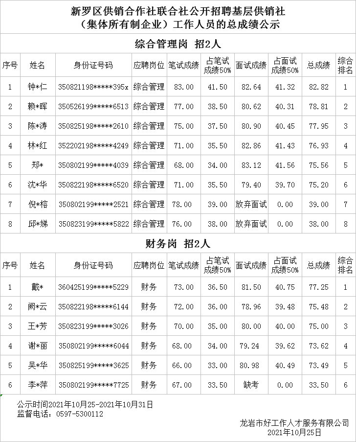您當(dāng)前的位置:首頁 > 新聞動(dòng)態(tài) > 【總成績(jī)公示】新羅區(qū)供銷合作社聯(lián)合社公開招聘基層供銷社 (集體所有制企業(yè))工作人員的總成績(jī)公示