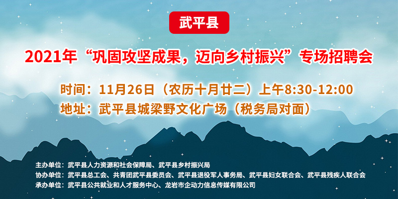 聯(lián)系地址:武平縣人力資源和社會保障局人力資源市場(武平縣人力資源和社會保障局一樓)