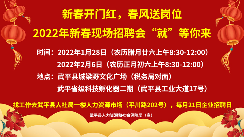 • 歡迎關注武平縣新春開門紅,春風送崗位 2022年新春現(xiàn)場招聘會 “就”等你來