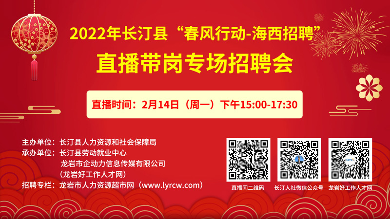 您當(dāng)前的位置:首頁(yè) > 新聞動(dòng)態(tài) > 【直播回放】2022年長(zhǎng)汀縣“春風(fēng)行動(dòng)-海西招聘”直播帶崗專場(chǎng)招聘會(huì)