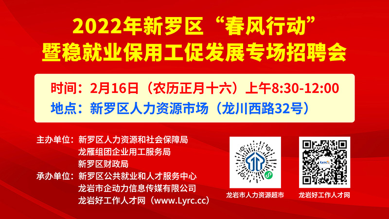 • 【正月十六上午】2022年新羅區(qū)“春風行動”暨穩(wěn)就業(yè)保用工促發(fā)展專場招聘會