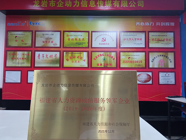 •  2022年2月26日,福建省人社廳授予龍巖市企動力信息傳媒有限公司“2019-2020年度福建省人力資源誠信服務(wù)領(lǐng)軍企業(yè)”榮譽稱號正式授牌。此稱號充分肯定了公司在進一步推進全省人力資源行業(yè)的誠信體系建設(shè)和提高行業(yè)誠信水平中做出的貢獻。