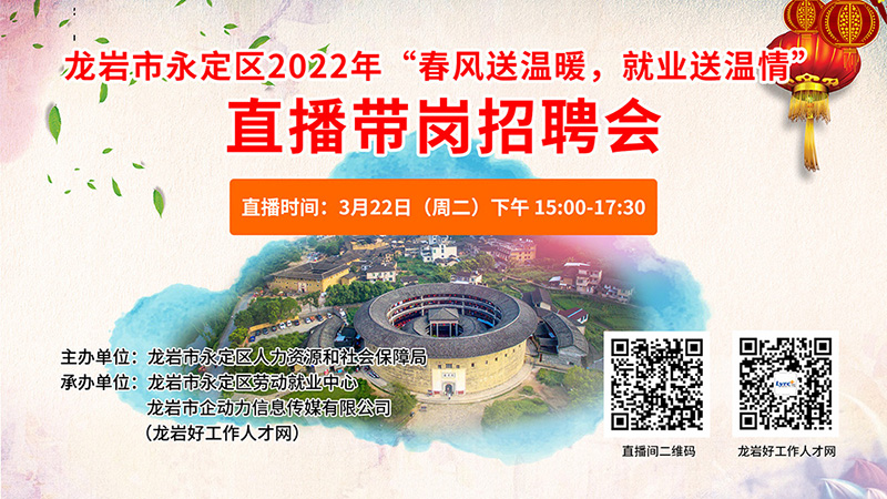 • 【直播回放】龍巖市永定區(qū)2022年“春風(fēng)送溫暖,就業(yè)送溫情”直播帶崗招聘會(huì)