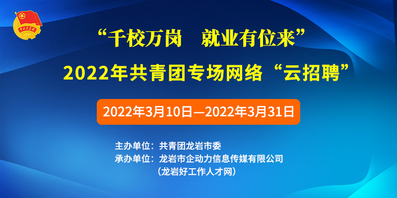 •     為落實(shí)黨中央、國(guó)務(wù)院“六穩(wěn)”“六保”決策部署,深入貫徹2022年全國(guó)教育工作重要指示精神,全力推進(jìn)高校畢業(yè)生就業(yè)工作。深挖就業(yè)資源、拓寬就業(yè)渠道、促進(jìn)網(wǎng)絡(luò)招聘市場(chǎng)建設(shè),提供就業(yè)“云服務(wù)”,為高校畢業(yè)生和用人單位搭建供需橋梁,妥善幫助畢業(yè)生順利就業(yè)。共青團(tuán)龍巖市委員會(huì)擬舉辦“千校萬(wàn)崗,就業(yè)有位來(lái)”2022年共青團(tuán)專(zhuān)場(chǎng)網(wǎng)絡(luò)“云招聘”,具體方案如下: