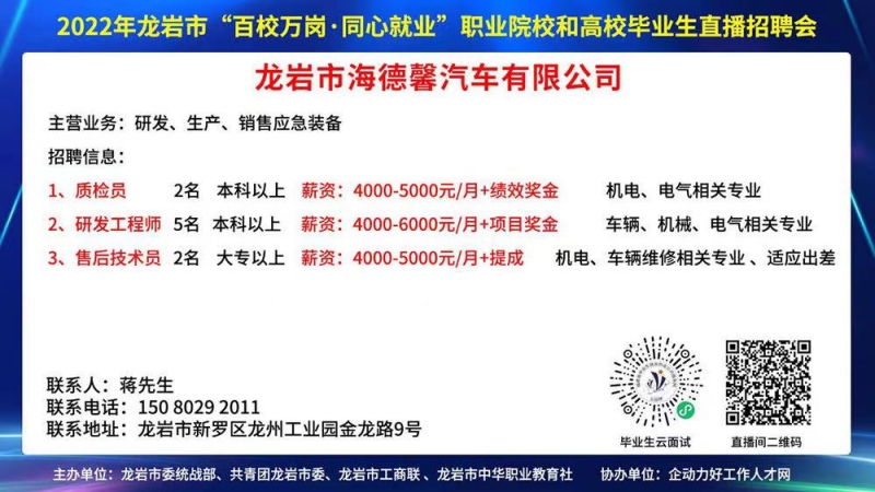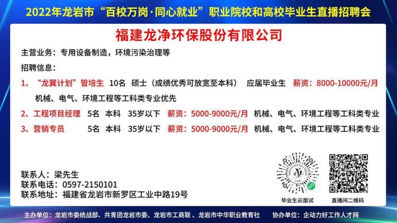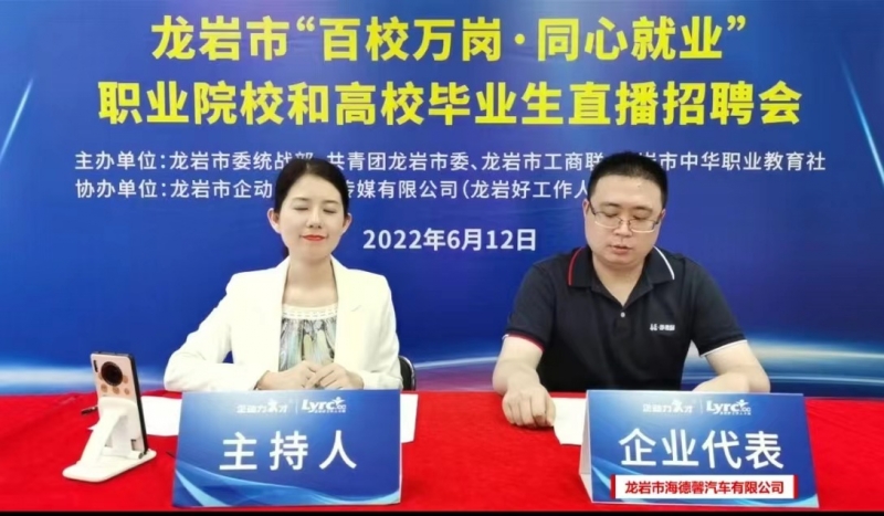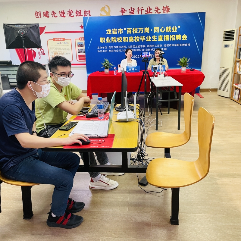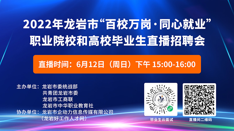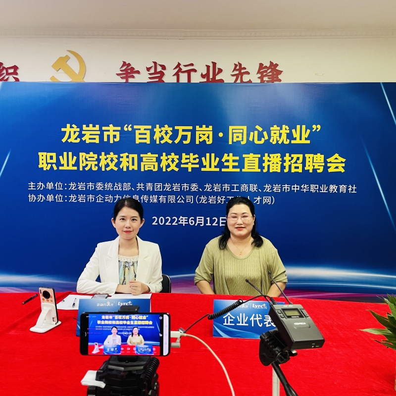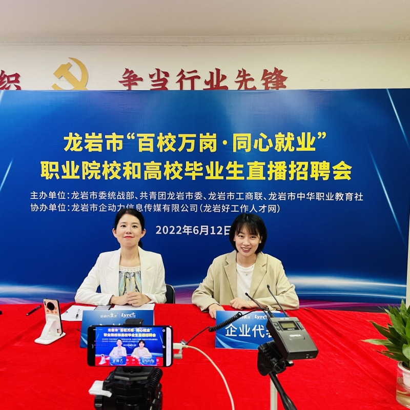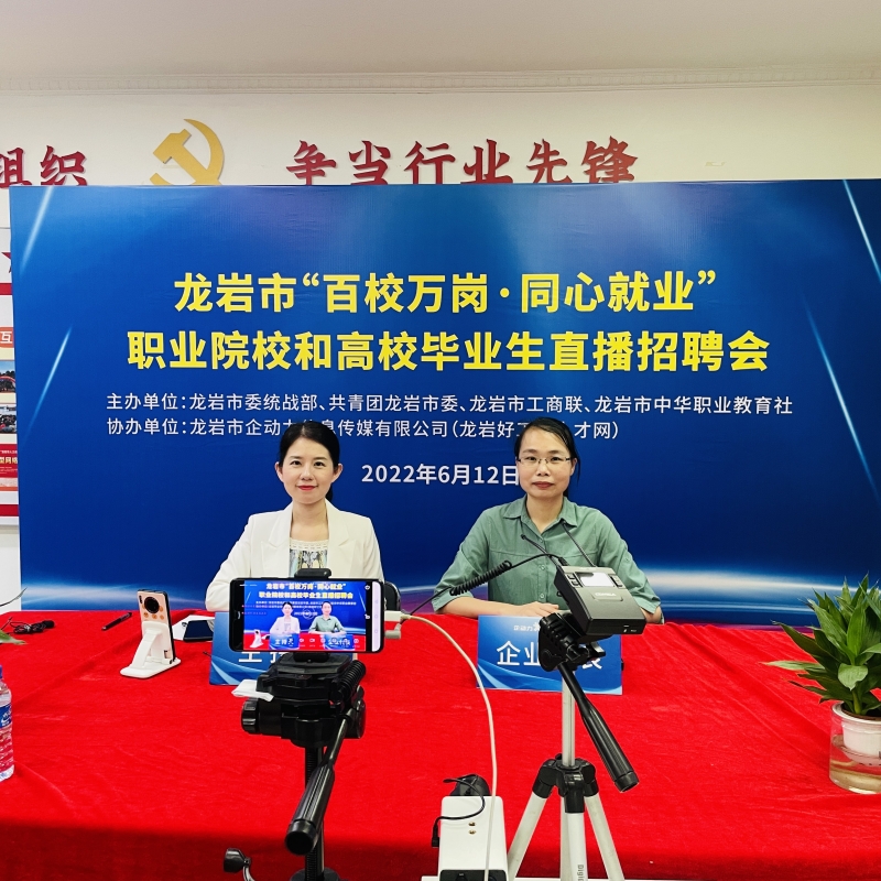 •  為深入貫徹省委關于做大做強做優(yōu)“四大經(jīng)濟”的工作部署,結合深入實施“提高效率、提升效能、提增效益”行動,省委統(tǒng)戰(zhàn)部、團省委、省工商聯(lián)、省中華職教社聯(lián)合開展“百校萬崗·同心就業(yè)”行動計劃,助力非公有制企業(yè)解決用工難題,促進廣大職業(yè)院校和民辦高校學生高質量就業(yè),為全方位推進高質量超越貢獻力量。2022年6月12日,由市委統(tǒng)戰(zhàn)部、共青團龍巖市委、龍巖市工商聯(lián)、市中華職業(yè)教育社主辦,龍巖市企動力信息傳媒有限公司(龍巖好工作人才網(wǎng))協(xié)辦的2022年龍巖市“百校萬崗 同心就業(yè)”職業(yè)院校和高校畢業(yè)生直播招聘會成功舉辦。