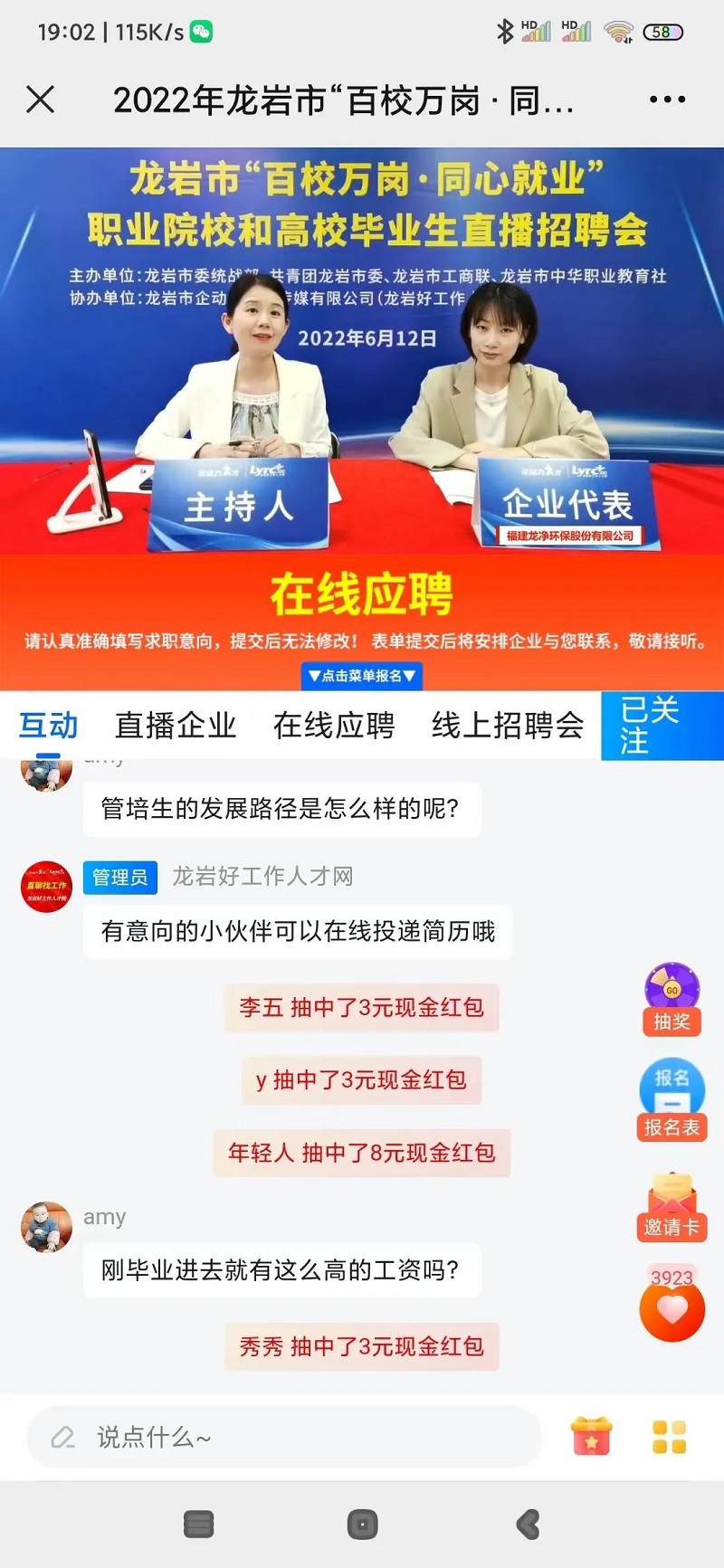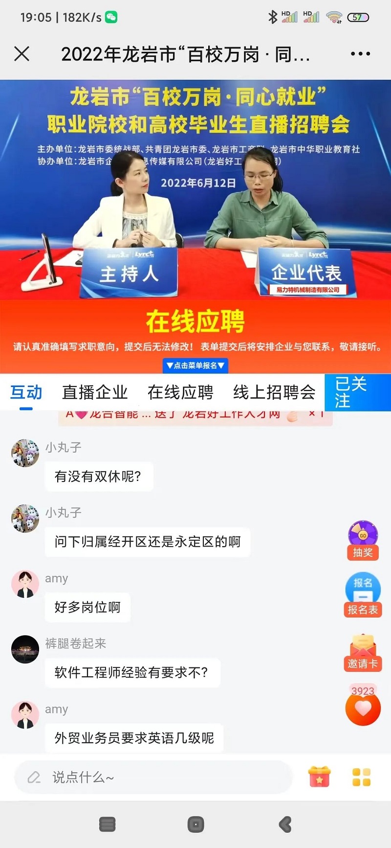 本次活動通過收集篩選50家龍巖市內(nèi)知名企業(yè)參加線上招聘會,精選5家企業(yè)招聘負責人直播在線講解,求職問題隨時解答,讓求職者在家就能在線投遞簡歷,實現(xiàn)投遞簡歷、線上面試“一站式”就業(yè)服務。