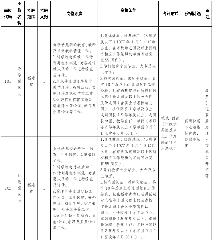 (一)根據(jù)幼兒園發(fā)展規(guī)劃,本次先行招聘2名副園長(zhǎng)。根據(jù)考評(píng)情況,開(kāi)園后其中一人可擬定副園長(zhǎng)(主持工作),待一年期滿(mǎn)后經(jīng)考核,可視情況從中遴選園長(zhǎng)1名。
