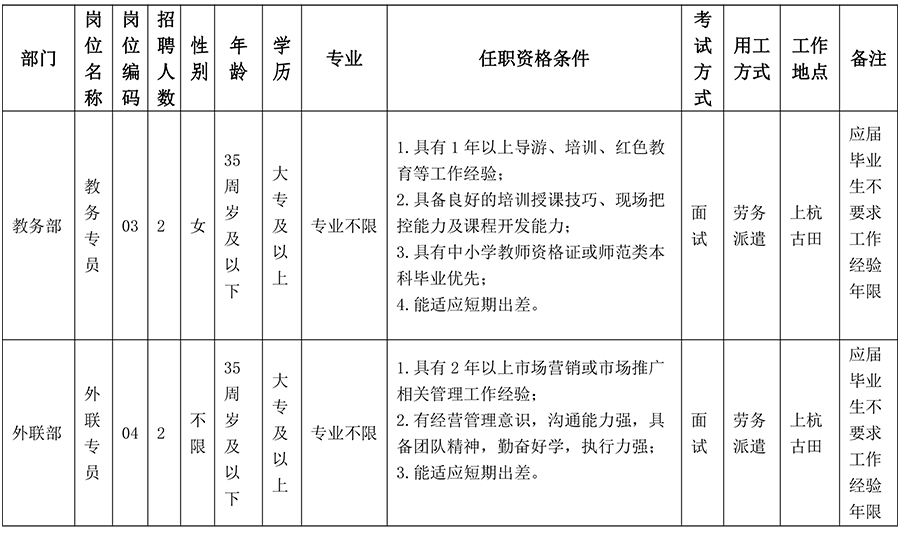 •   龍巖市圣地古田文化傳播有限公司是上杭縣屬一級(jí)國(guó)企上杭古田建設(shè)發(fā)展有限公司所屬全資子公司,是龍巖市人民政府批準(zhǔn)同意設(shè)立的集革命傳統(tǒng)教育、理想信念教育及素質(zhì)拓展培訓(xùn)服務(wù)為一體的專(zhuān)業(yè)培訓(xùn)機(jī)構(gòu)。龍巖市圣地古田文化傳播有限公司依托古田及周邊地區(qū)的革命歷史資源和教學(xué)資源的優(yōu)勢(shì),緊緊圍繞“不忘初心,牢記使命”這個(gè)主題,以堅(jiān)定理想信念、加強(qiáng)黨性修養(yǎng)、錘煉優(yōu)秀作風(fēng)為目的,創(chuàng)造新的教學(xué)模式,形成一套完備豐富的教學(xué)模式體系,F(xiàn)因各公司業(yè)務(wù)拓展需要,決定面向社會(huì)公開(kāi)招聘部分崗位工作人員。現(xiàn)將有關(guān)招聘事項(xiàng)公告如下: