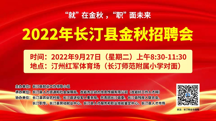 • 【9月27日長(zhǎng)汀現(xiàn)場(chǎng)招聘會(huì)】2022年長(zhǎng)汀縣金秋招聘會(huì)