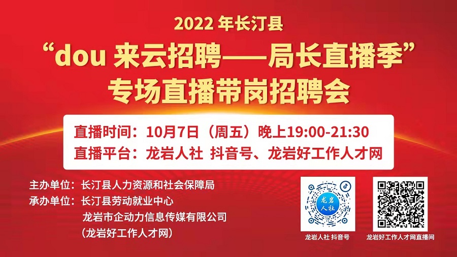 •   10月7日晚,長汀縣舉行“dou來云招聘——局長直播季”專場直播帶崗招聘會,招聘會由縣人力資源和社會保障局主辦,縣勞動就業(yè)中心和龍巖市企動力信息傳媒有限公司承辦。