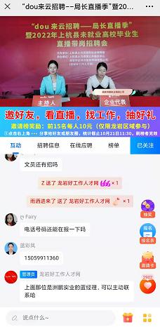 •   2022年10月21日上午,由上杭縣人力資源和社會(huì)保障局主辦,上杭縣人力資源公共服務(wù)中心及龍巖市企動(dòng)力信息傳媒有限公司(龍巖好工作人才網(wǎng))承辦的“dou 來云招聘--局長直播季”暨2022年上杭縣未就業(yè)高校畢業(yè)生直播帶崗招聘會(huì)圓滿完成。
