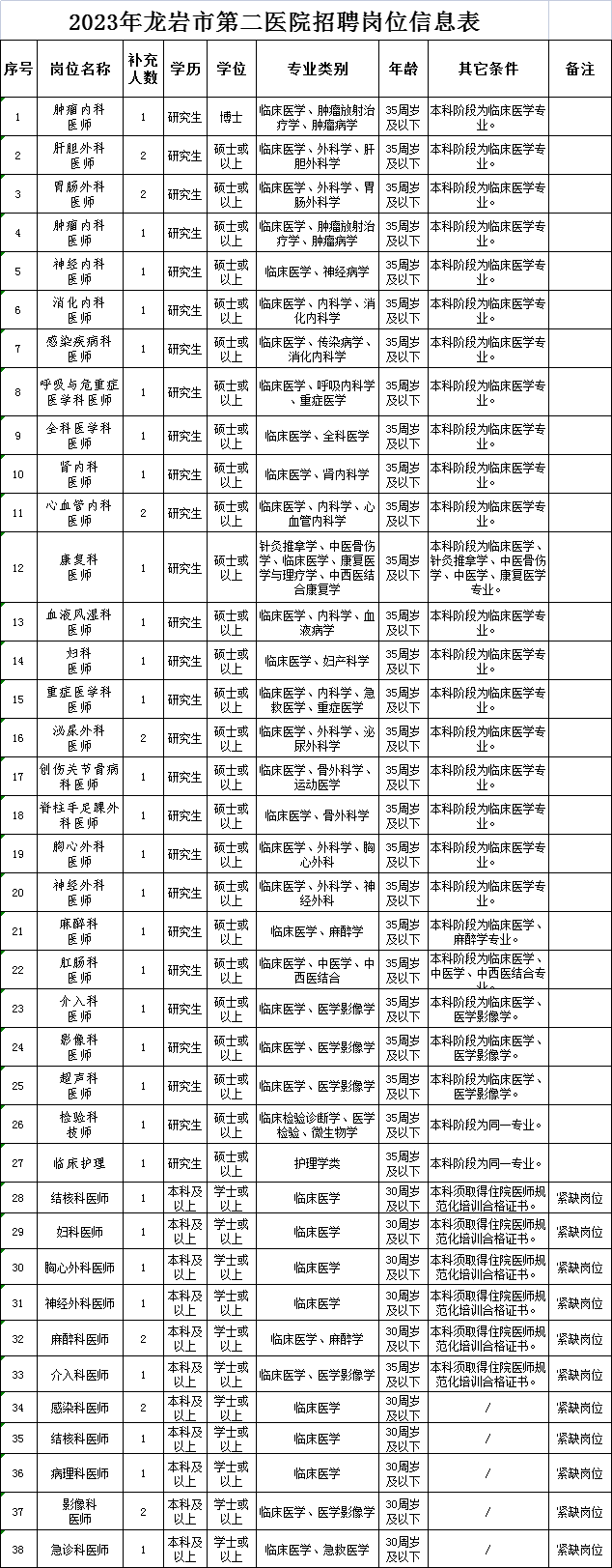 1.2023年龍巖市第二醫(yī)院招聘職位信息表