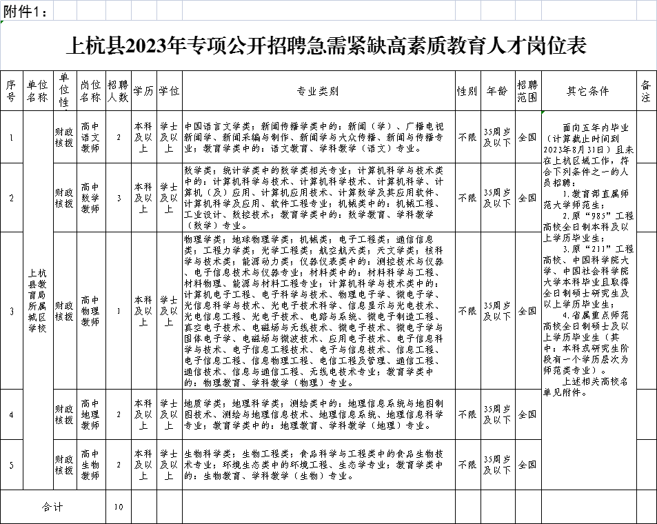 本次專項招聘人員為事業(yè)單位編制內(nèi)工作人員,招聘崗位5個,計劃招聘人數(shù)10人。具體招聘崗位詳見《上杭縣2023年專項公開招聘急需緊缺高素質(zhì)教育人才崗位表》(附件1)。