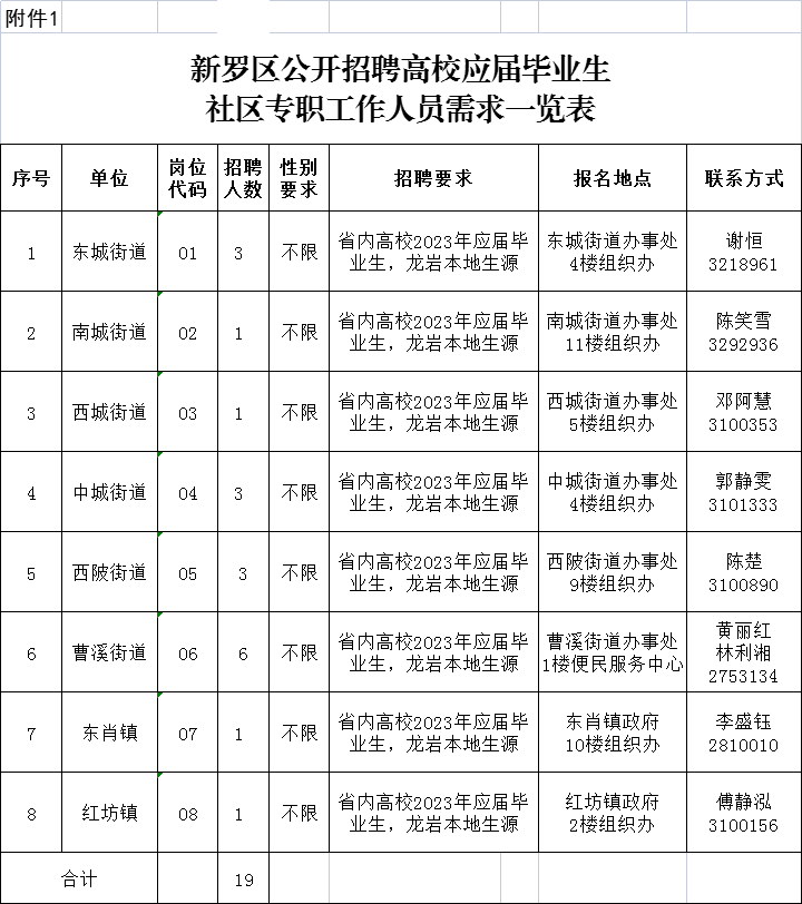 本次公開招聘高校應屆畢業(yè)生社區(qū)專職工作人員共 19 名。具體招聘崗位詳見附件1。