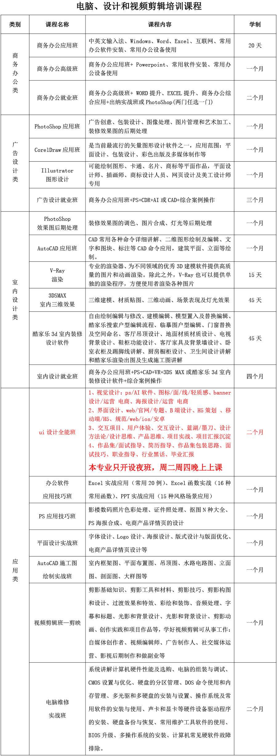 專業(yè)齊全:開設(shè)商務(wù)辦公類、廣告設(shè)計類、應(yīng)用類等二十幾種專業(yè)課程。