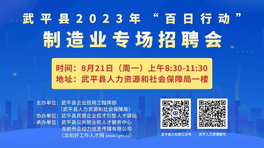 • 【8月21日】武平縣2023年“百日行動(dòng)”制造業(yè)專(zhuān)場(chǎng)招聘會(huì)公告