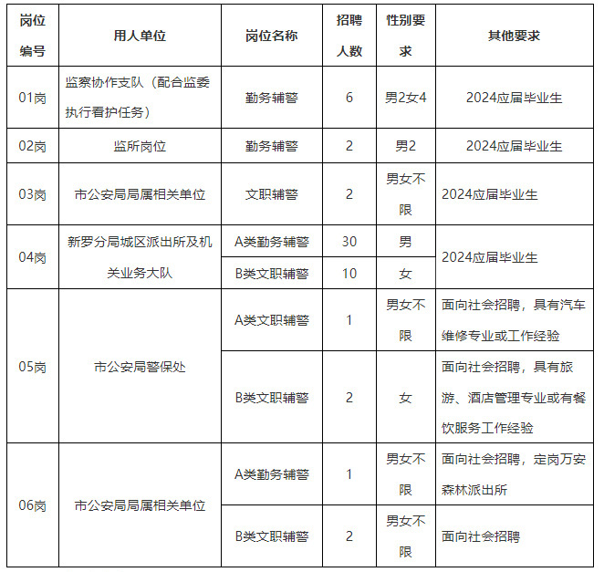 •      因工作需要,龍巖市公安局擬面向龍巖學院、閩西職業(yè)技術(shù)學院2024應屆畢業(yè)生及社會公開招聘警務輔助人員(以下簡稱輔警),現(xiàn)將 有關(guān)事項公告如下: