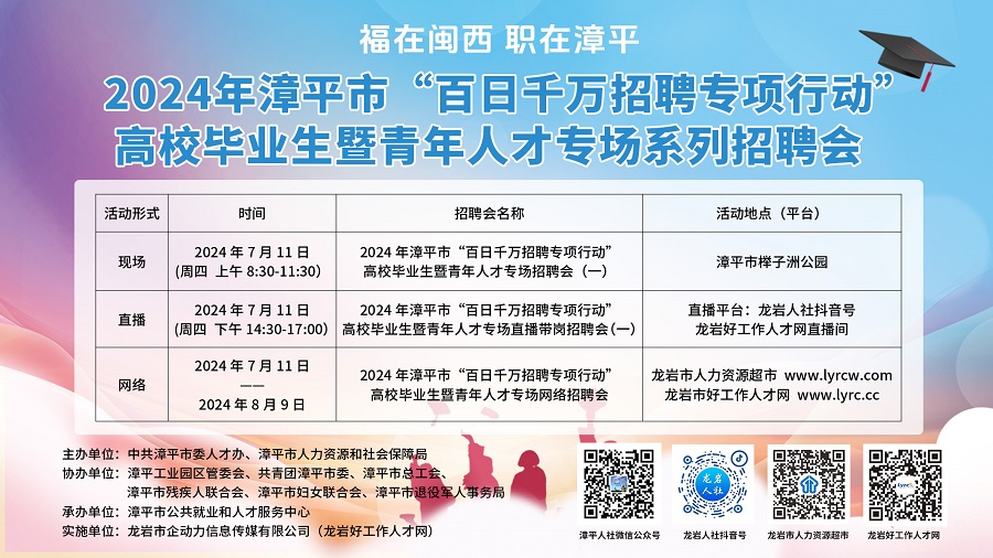 • 【7月11日】2024年漳平市“百日千萬招聘專項行動”高校畢業(yè)生暨青年人才專場系列招聘會公告